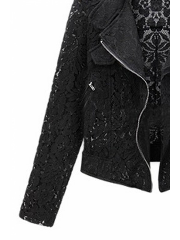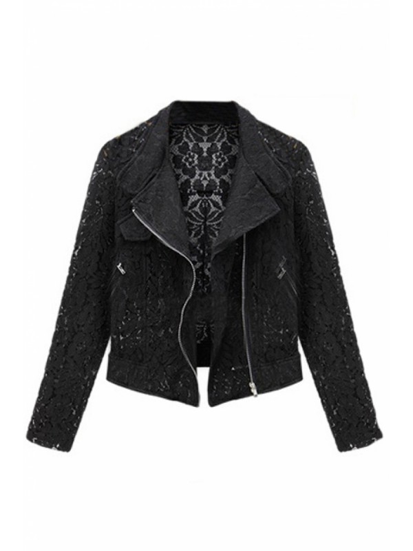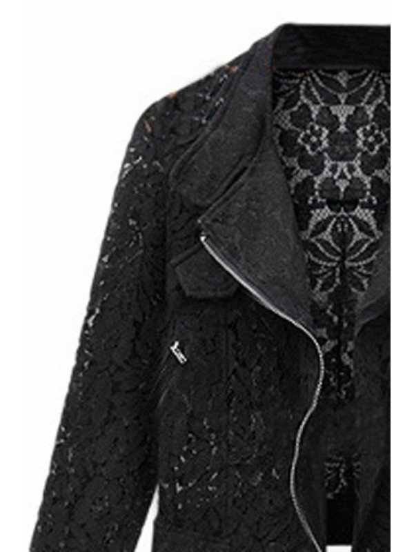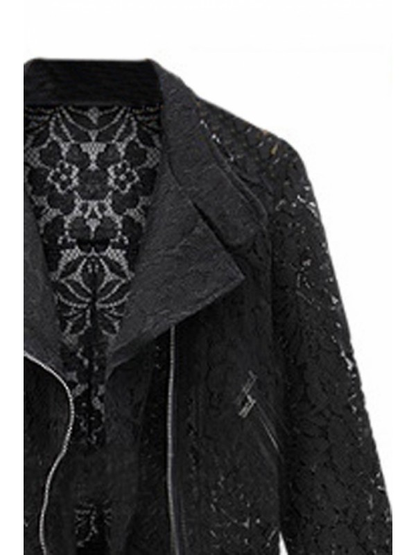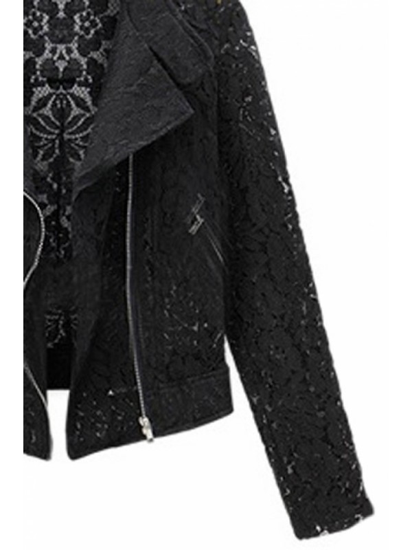 XS: Shoulder width:39cm Bust:84cm Waist:80cm Length:50cm Sleeves:55cm S: Shoulder width:40cm Bust:88cm Waist:84cm Length:51cm Sleeves:56cm M: Shoulder width:41cm Bust:92cm Waist:88cm Length:52cm Sleeves:57cm L: Shoulder width:42cm Bust:96cm Waist:92cm Length:53cm Sleeves:58cm Description Black lace coat, featuring lapels and long sleeves, zipper fastening front, doulbe oblique zipper, hollowed flower details, short length. Best choice for fours seasons. High street and relaxed style design. Fabric Lace Washing Dry clean.
