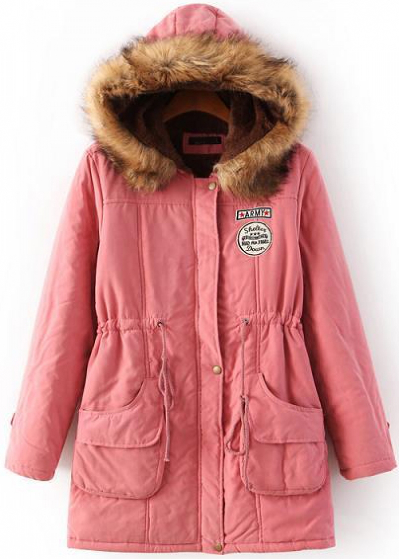 Pink Faux Fur Hooded Drawstring Pockets Coat