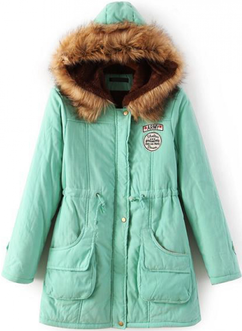 Green Faux Fur Hooded Drawstring Pockets Coat