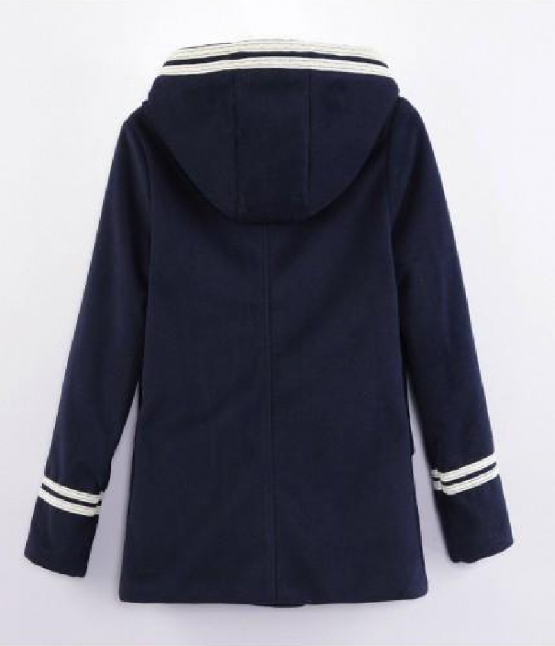 Hooded Self-tied Elastic Buttoned Navy-blue Coat