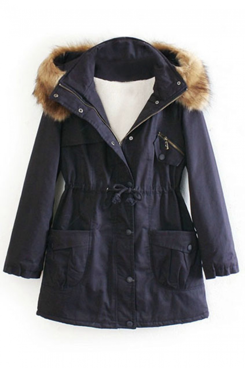 Navy Long Sleeve Fur Hooded Pockets Coat
