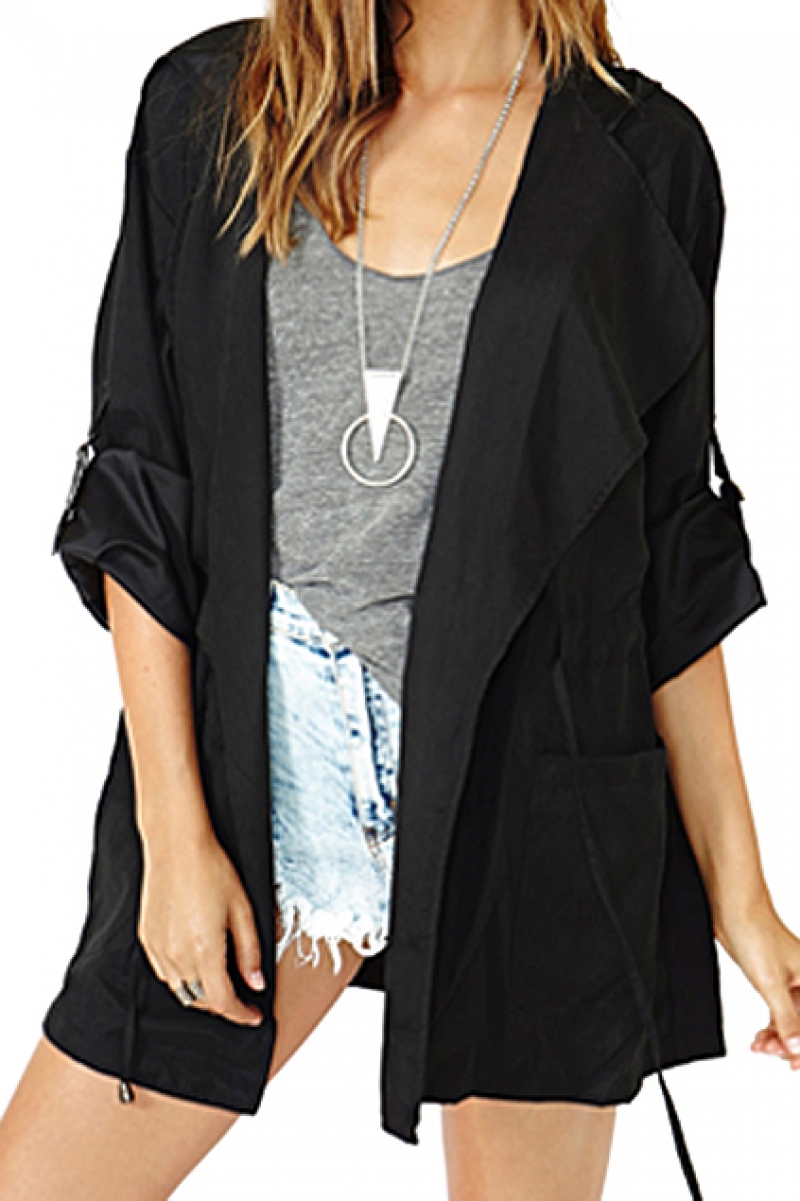 Rolled-up Sleeves Drawstring Hooded Black Coat
