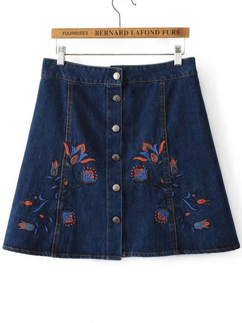 Green High Waist Embroidery Floral Corduroy A-line Skirt