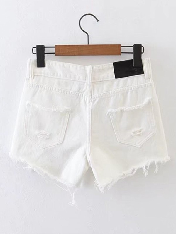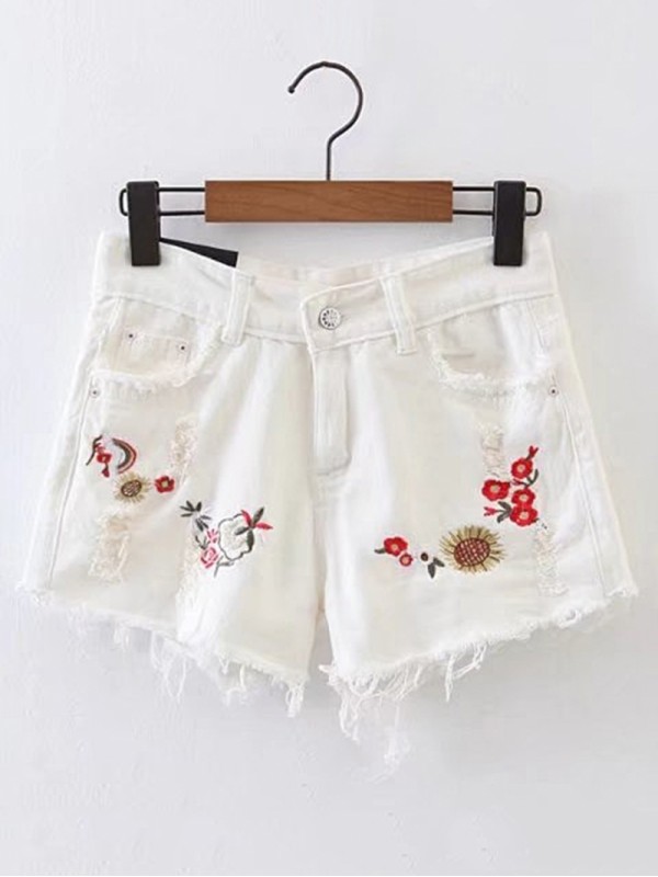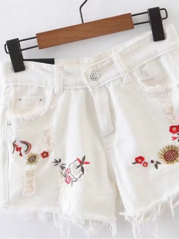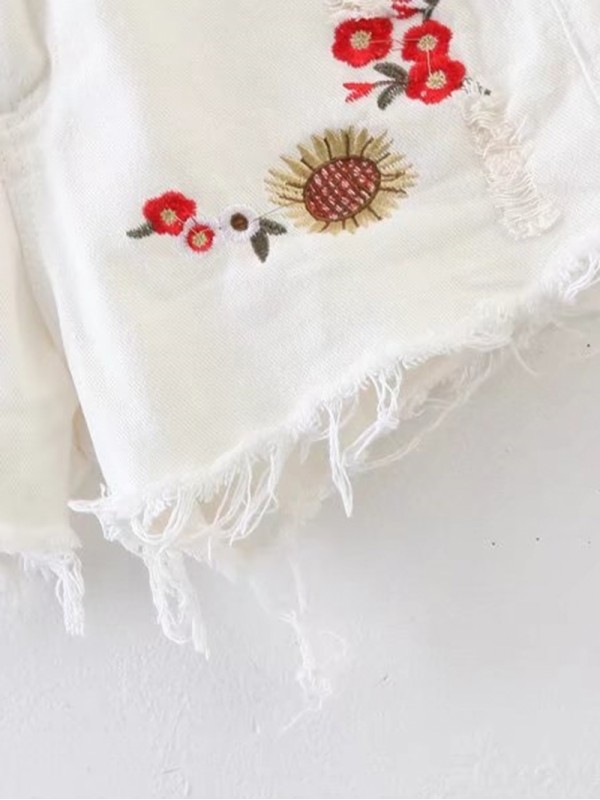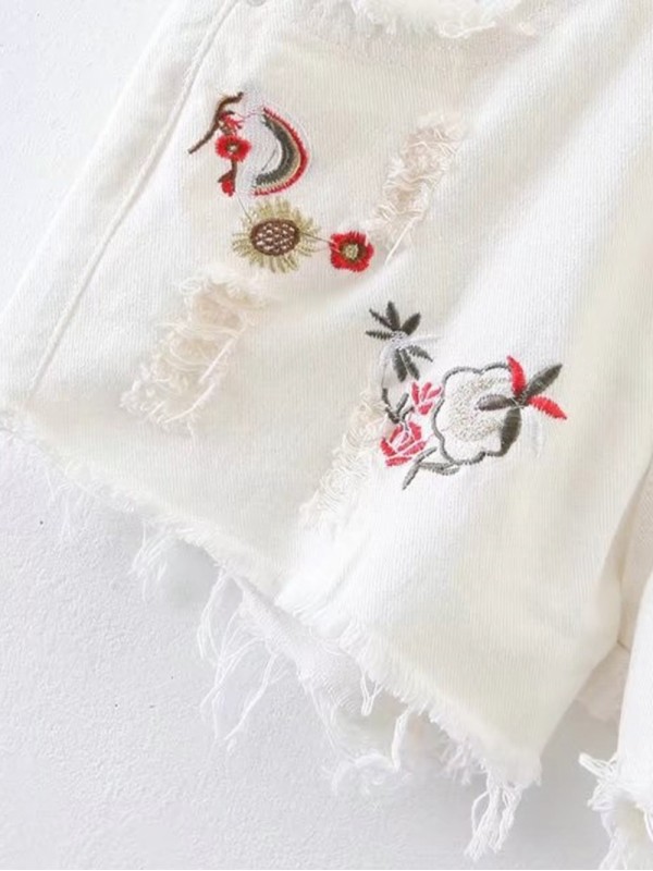 Raw Hem Ripped Detail Embroidery Denim Shorts