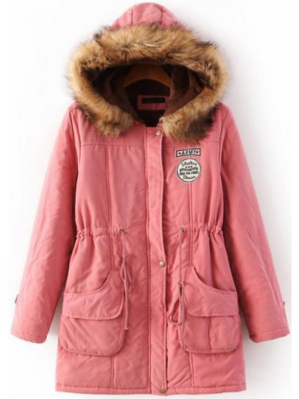 • Pink Faux Fur Hooded Drawstring Pockets Coat